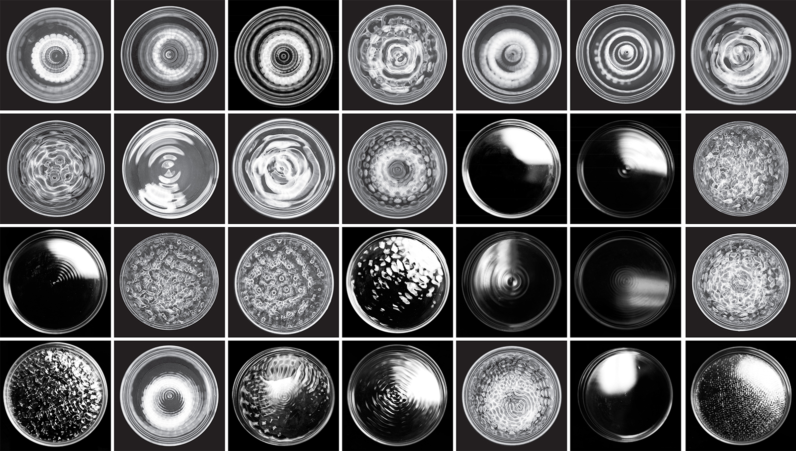 The device generated sound through the connected tone generator where the water is catches by the vibrations. Different patterns are created depending on the driven frequency, the given time period and the amount of volume. HzO 5-115Hz shows an overview of 28 black and white photographs, in which the artist has captured the patterns from 5 to 115 Hertz with her camera.